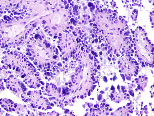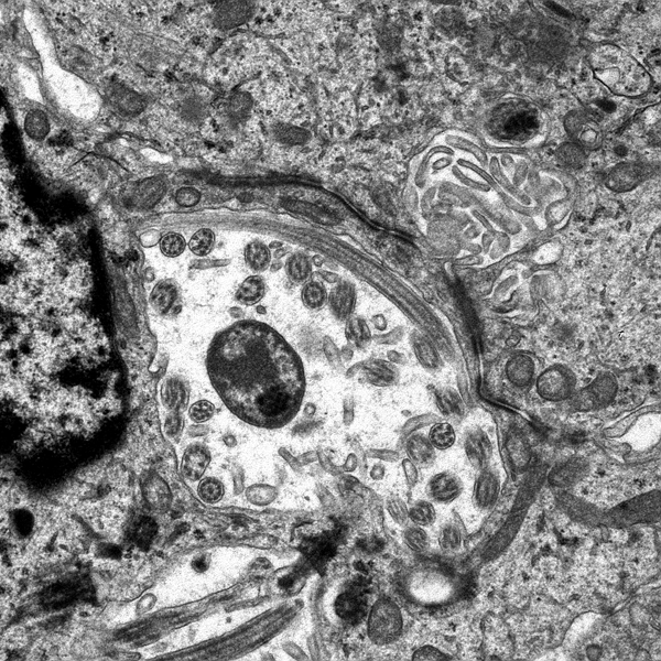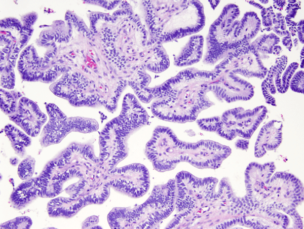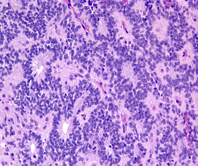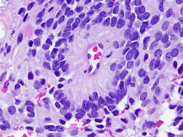 Microscopically, the tumor cells resemble normal ependymal cells and are arranged in perivascular pseudorosettes (tumor cell nuclei located at some distance from a central vessel with delicate processes radiating toward the vessel wall), tubular structures like the central canal of the spinal cord, and papillary formations. Ependymoma has distinctive ultrastructural features, including cilia, microvilli, and desmosomes. Ependymomas are graded as grade II or III according to the WHO system. Most are low-grade (WHO grade II). Some have increased cellular density, mitoses, necrosis, and microvascular proliferation while retaining the typical ependymoma tissue pattern (anaplastic ependymoma, WHO grade III).