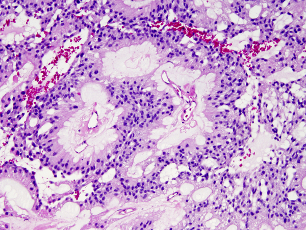 There are 2 WHO grade I special variants of ependymoma: Myxopapillary ependymoma is characterized by papillary formations with a mucinous core and arises most commonly in the lumbosacral spinal cord and sometimes in the soft tissues of the lumbosacral region. Subependymoma, is most commonly an intraventricular (4th ventricle) tumor of adults. It is a firm, nodular tumor, consisting of uniform cells in a fibrillary stroma with cystic degeneration.